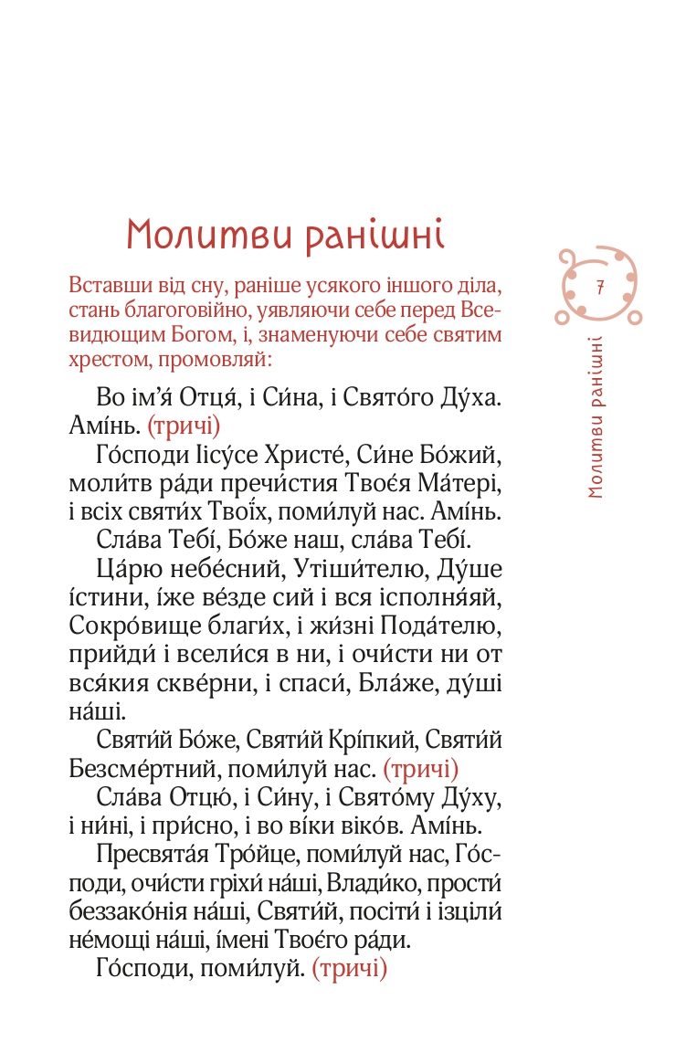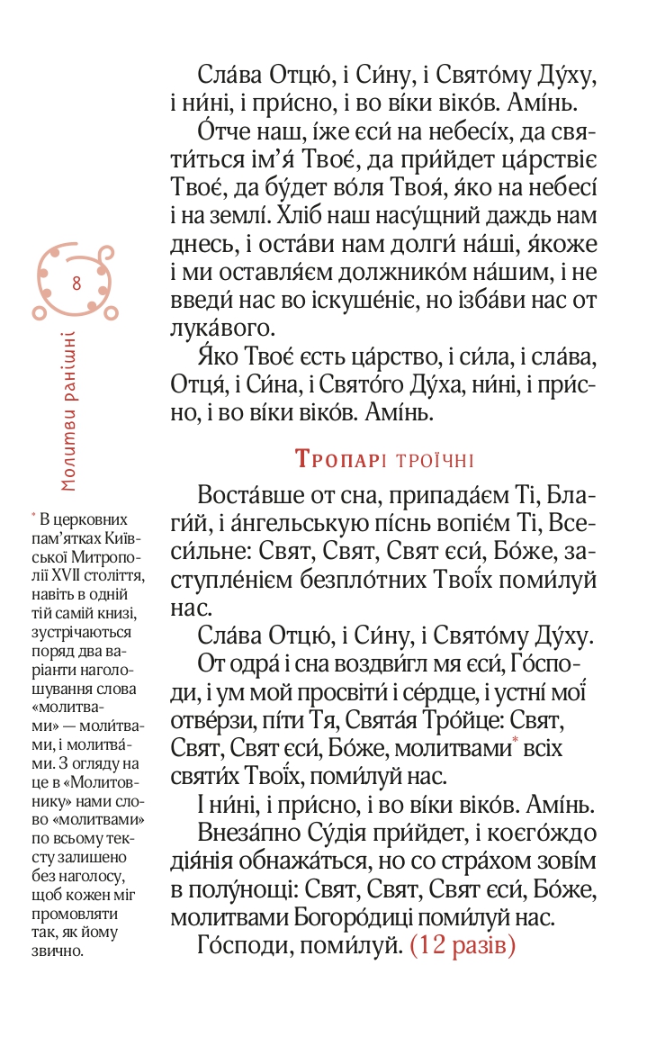 Молитовник укладено за богослужбовими виданнями Київської Митрополії XVII століття. Молитви, що складають зміст Молитовника, було вивірено за стародруками, які зберегли приклад церковнослов’янської мови київського ізводу (редакції). Для зручності тексти київського ізводу подаються в транслітерації сучасним українським алфавітом і таким чином кожен може наблизитися до тієї давньої української вимови, якою молився величезний православний край по обидва боки Дніпра, мiльйони і мільйони християн.